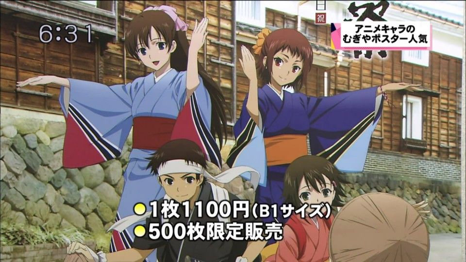 南砺市観光協会は、これを記念して、城端を舞台にしたアニメ「TrueTears」のキャラクターが、むぎや踊りの衣装を着たデザインのポスターやチラシおよそ2万部を制作し、全国に配布したところ、販売を求める声が相次ぎました。