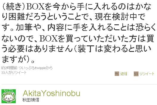 (続き)BOXを今から手に入れるのはかなり困難だろうということで、現在検討中です。加筆や、内容に手を入れることは恐らくないので、