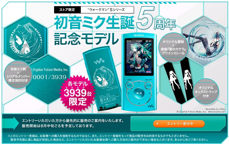 このモデルは、初音ミクの生誕5周年を記念し、“ウォークマン”Sシリーズ背面に描き下ろしのオリジナルデザインと、世界にひとつだけであることを証明するシリアルナンバーを刻印します。また、オリジナルデザインの壁紙と、初音ミク公式ホームページでショートバージョンのみで提供されている楽曲『星のカケラ』のフルバージョンをプリインストールしてお届けいたします。