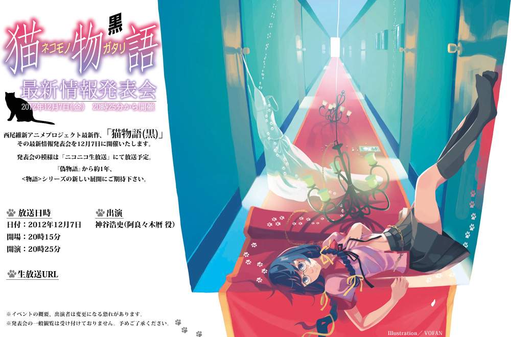 西尾維新アニメプロジェクト最新作、「猫物語(黒)」の公式サイトがオープンいたしました。12月7日(金)には「猫物語(黒) 最新情報発表会」も開催されます。 詳細は http://t.co/Qg9AzcgC