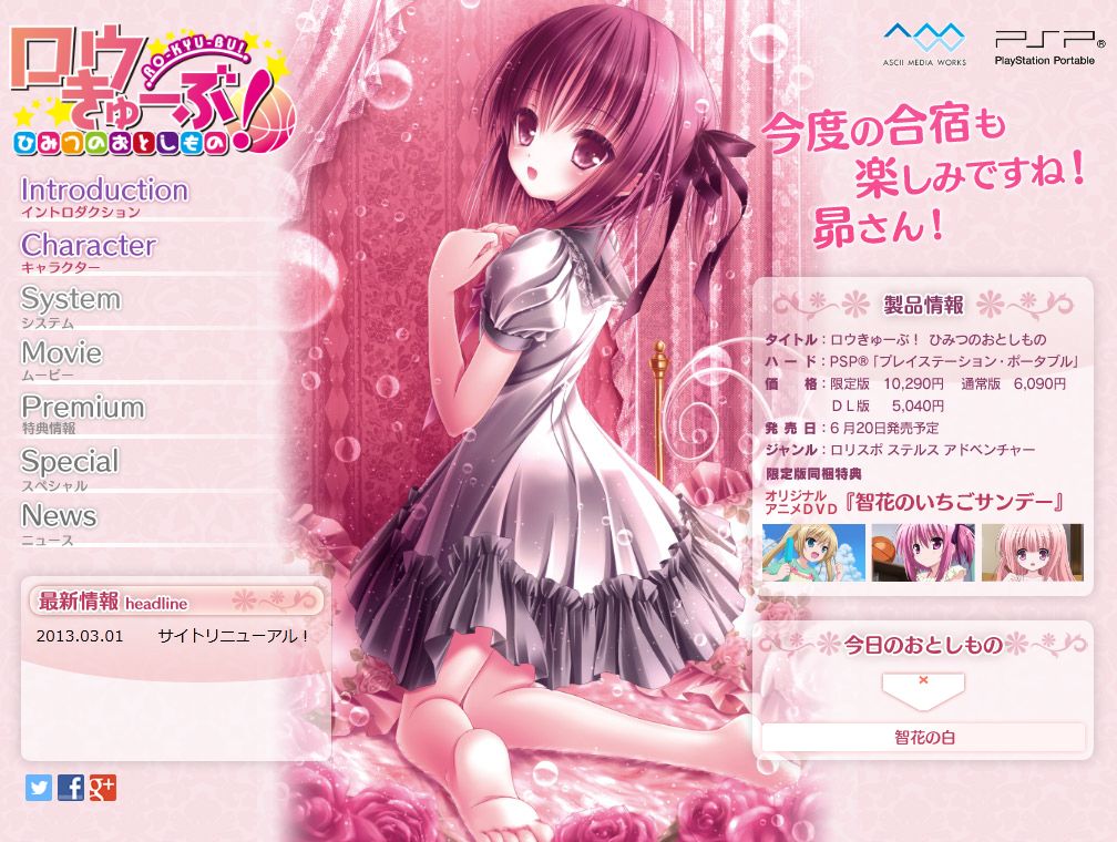 アスキー・メディアワークスは,PSP用ソフト「ロウきゅーぶ! ひみつのおとしもの」の発売日が2013年6月20日に決まったことを本日(3月1日)発表した。価格は,オリジナルアニメーションDVD「智花のいちごサンデー」を同梱した限定版が1万290円,通常版が6090円,ダウンロード版が5040円(いずれも税込)。