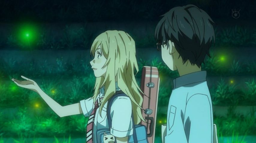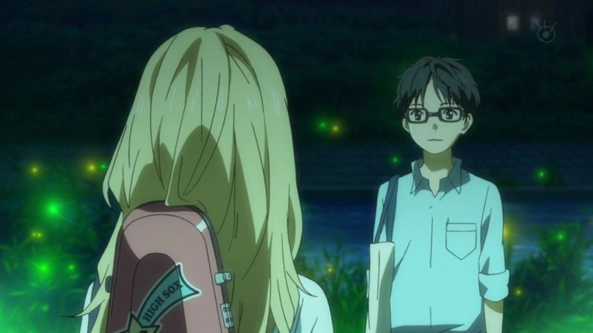 【四月は君の嘘】第11話 蛍のシーン、公生の演奏を聴いてわかってるのに「君は何を心の支えにしたの?」と重い病を隠しつつ尋ねるかをりは公生の覚悟を確認したかったのか?その時の公生の返答とBGMの当て方が良くてちょっとゾクッとした。瀬戸紘子、公生はここでも人脈に恵まれてる。 #君嘘