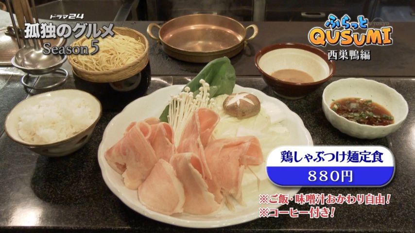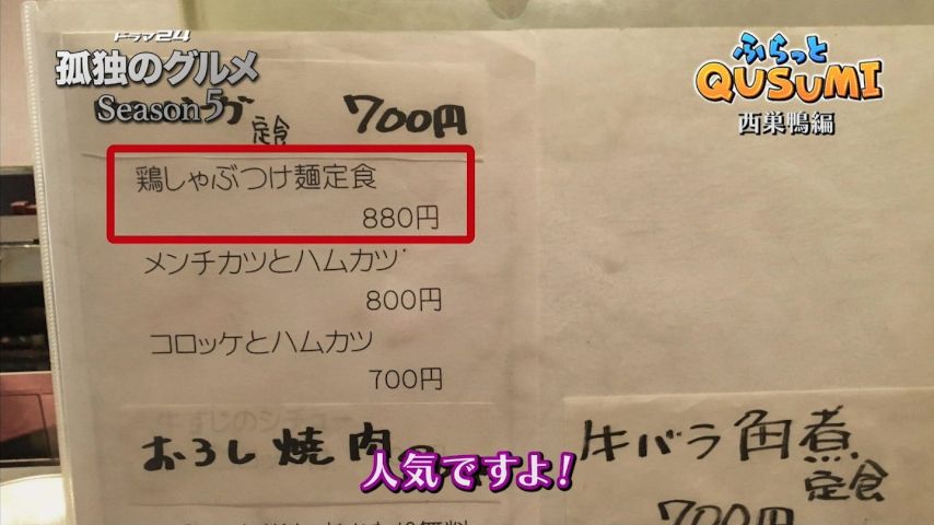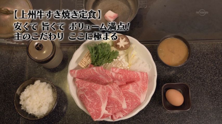 孤 独のグルメseason5最終回は1人すき焼き。上州肉すき焼き定食、あのボリュームで2,500円は安いと思ったら、安い普通のすきやき定食もボリュー ム満点で、鳥しゃぶつけ麺定食は880円で、更にご飯と味噌汁おかわり自由。この店、商売する気あるの?と疑いたくなるサービス精神に脱帽。