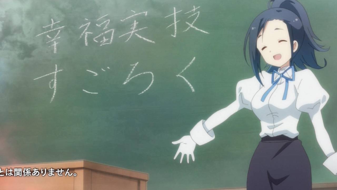 「あんハピ♪」第3話:凄いよなこの高校、たかが1クラスの1授業の為にどれだけ予算使っているんだろうwww やっとメイン5人が出揃ったが、5人ともキャラが強烈に濃い。ヒビキもキャラ的には十分強いのに、レンのクールでハードなツッコミや、パンで歯が粉砕するぼたんに喰われる位だもんね。