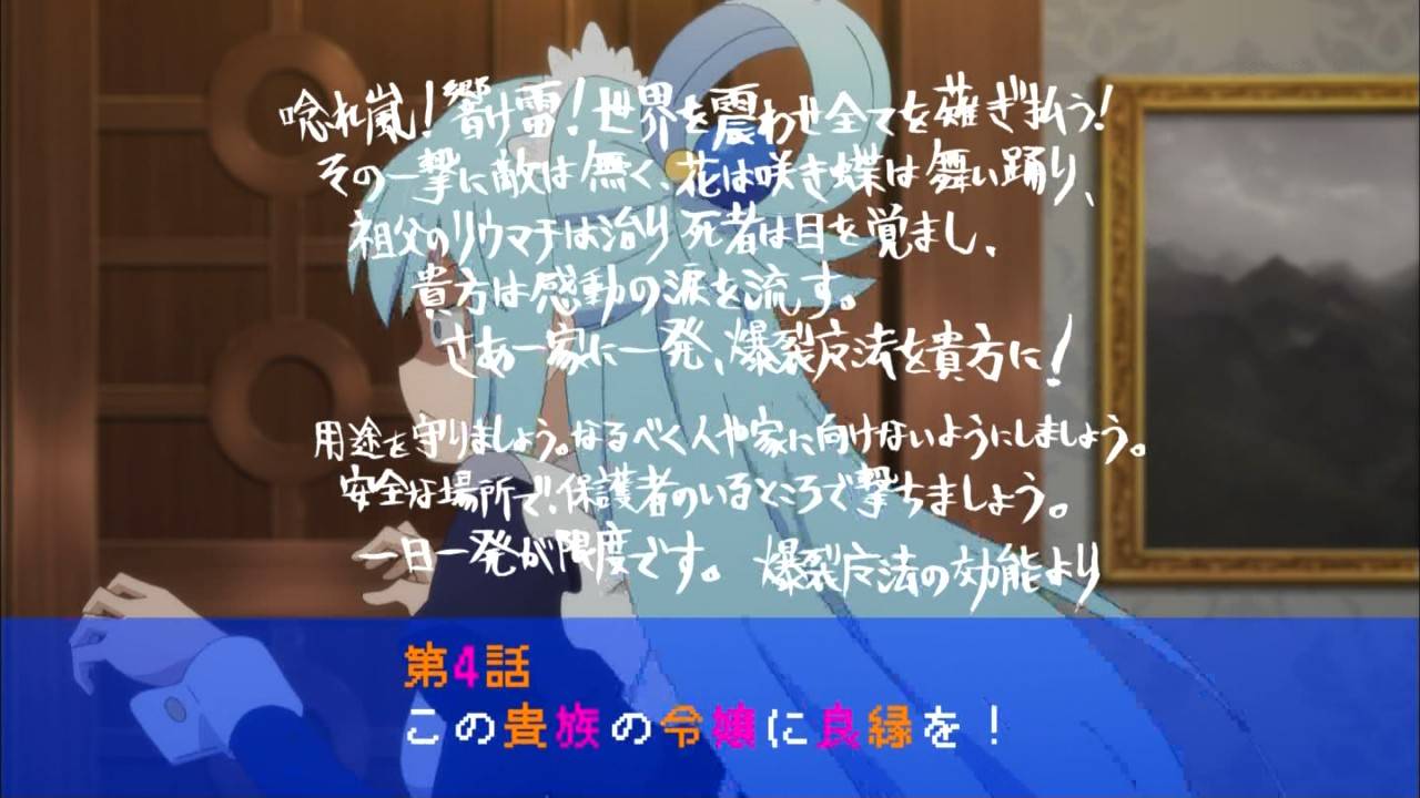 この素晴らしい世界に祝福を!2 3話終了 結局いつもの駄女神じゃねぇかwww誰おま状態なアクアが大活躍してたんだがそうだよな一応女神なんだよなアレでも さて初っ端カズマと仲良く爆裂魔法やってためぐみん外で遊んでんの可愛いかったが素直に待ってたんだな しかしクリス巻き込まれ過ぎだな