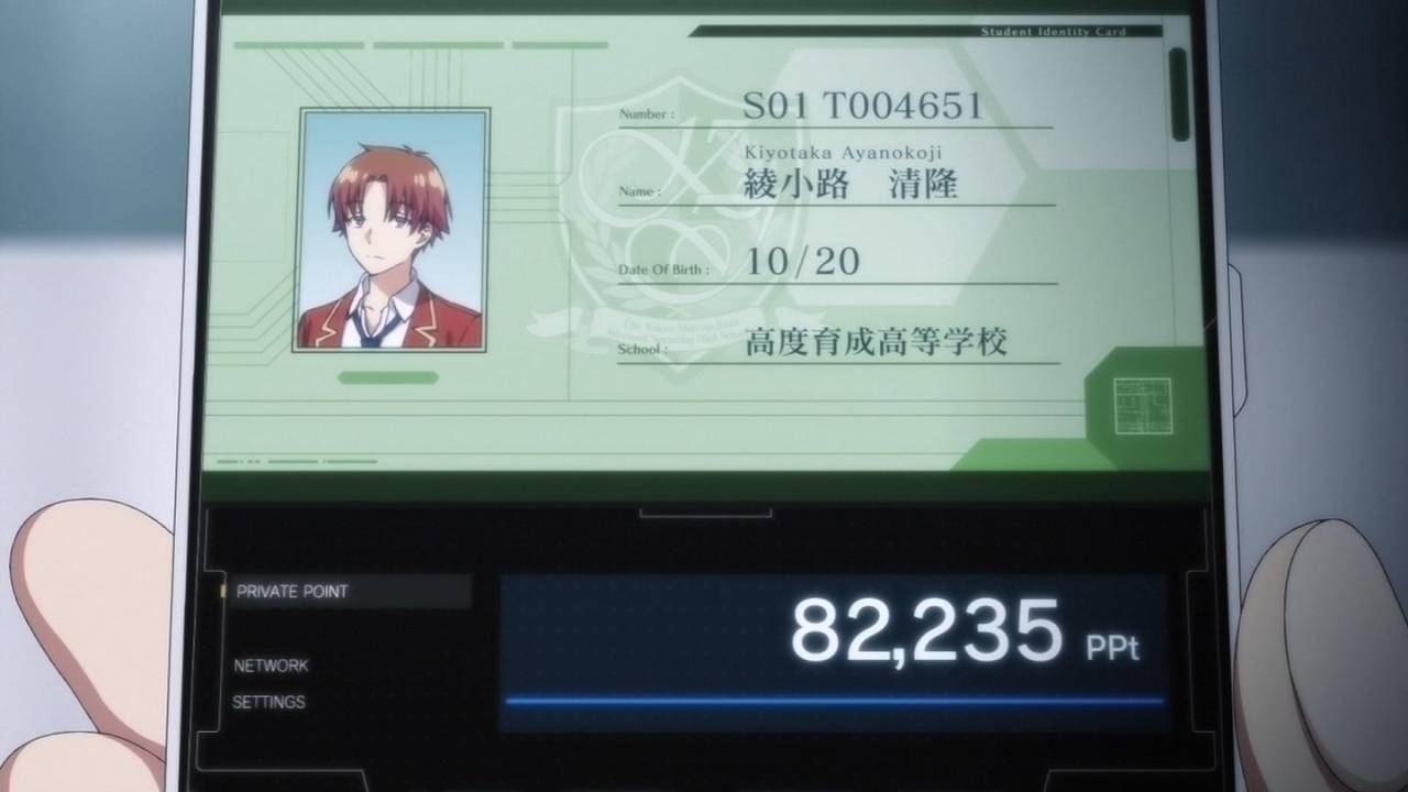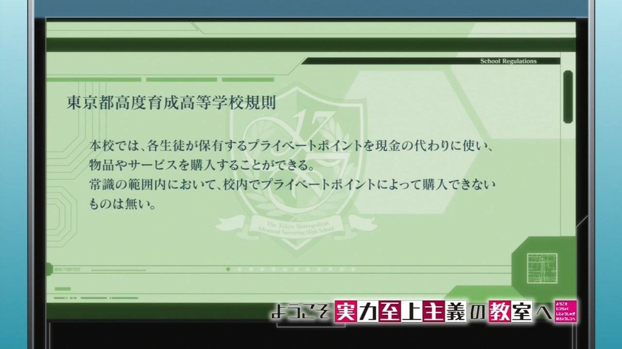 ようこそ実力至上主義の教室へ1話、無気力系の主人公は多々あれど、この作品の主人公ほど無気力なのも珍しい。入学早々10万円も貰えば無駄遣いしてしまうよね。しかしその真意を見抜けないようでは、この学校では生き残れない。ポイントを稼がなければ地獄を見る、過酷な学園サバイバルの始まりか?