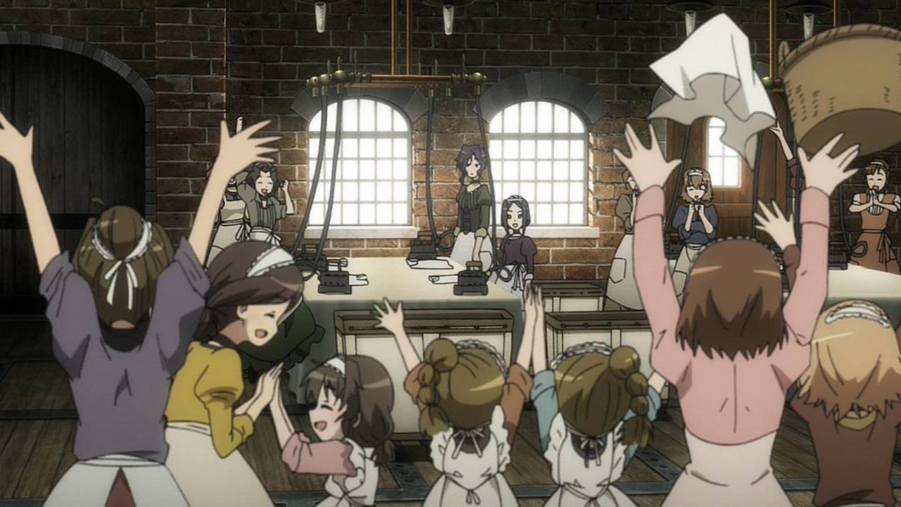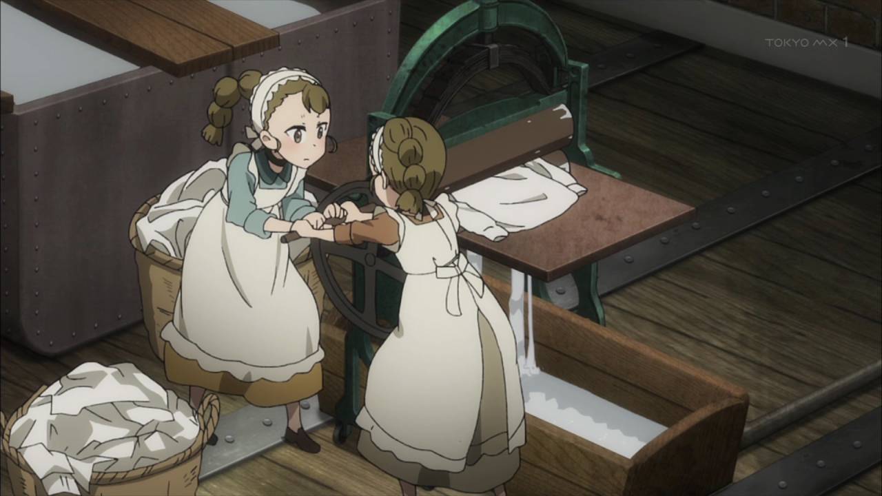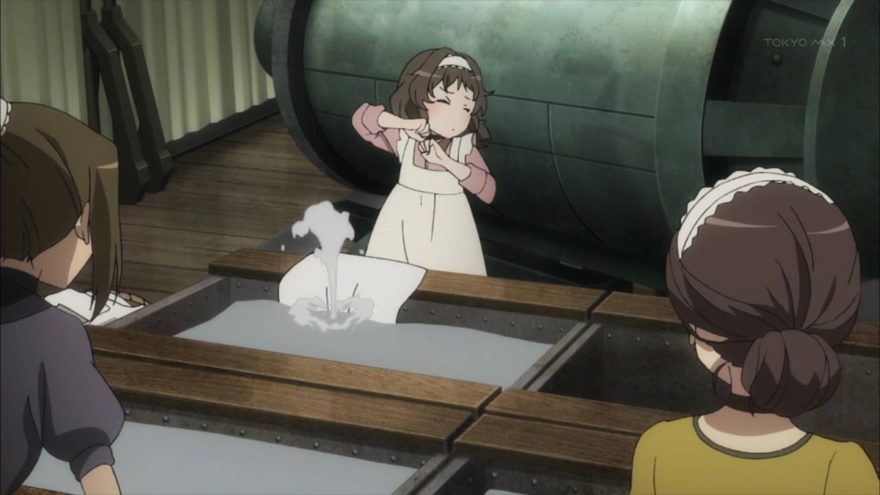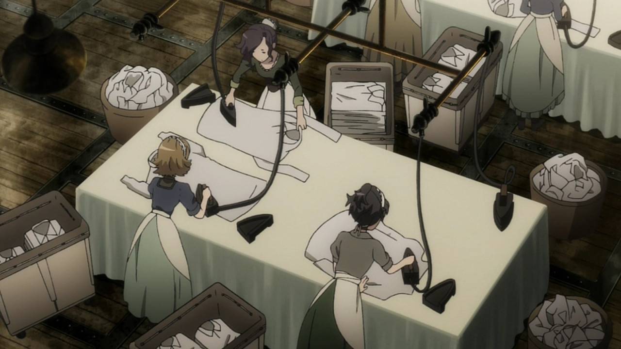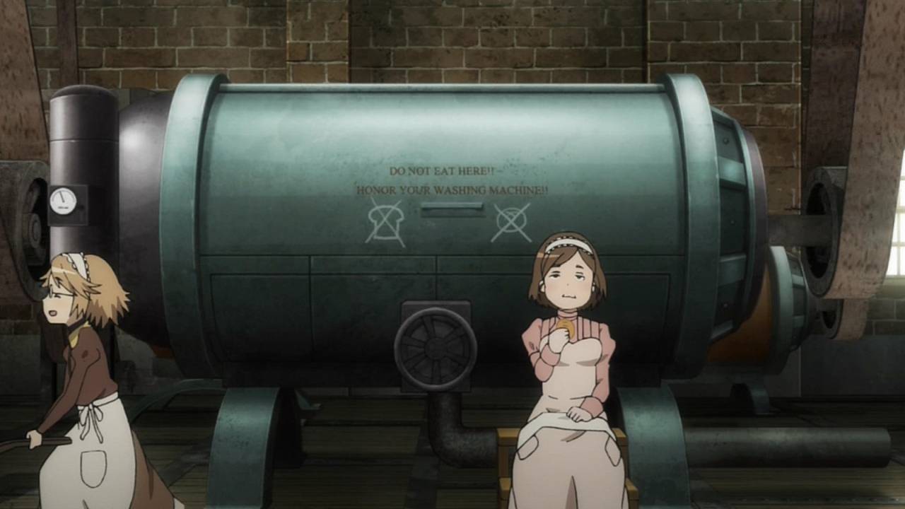 「プリンセス・プリンシパル」第7話:ここ最近悲しい話が続いていたが、今回は最後まで爽やかだったので安心した。とはいえ、洗濯場を買い取るプリンセスに、機械を直すベアト、効率的な洗濯方法を教えるちせと、社員達に感謝される連中の行動を、任務遂行の為と割り切るクールさはやはりスパイ物。