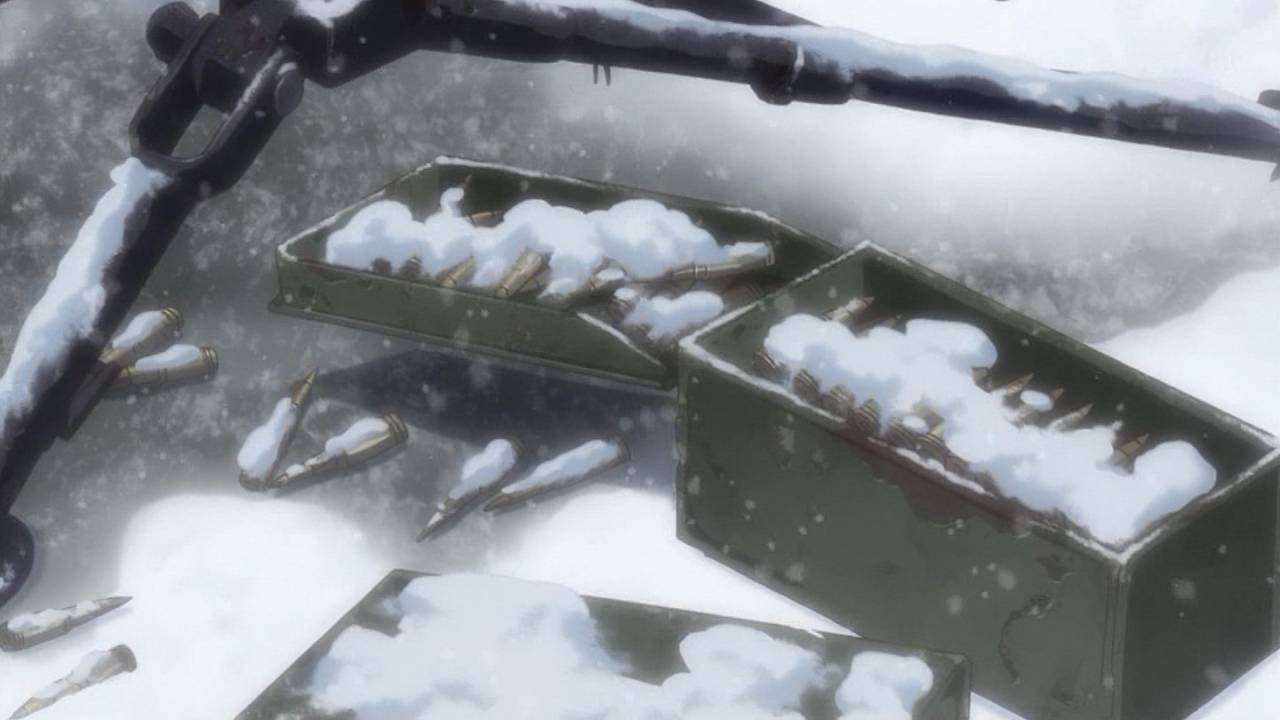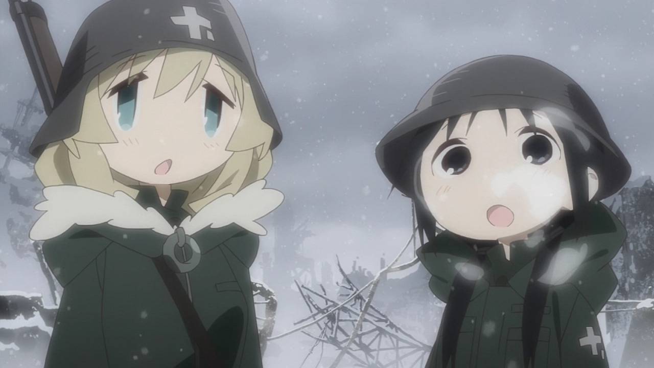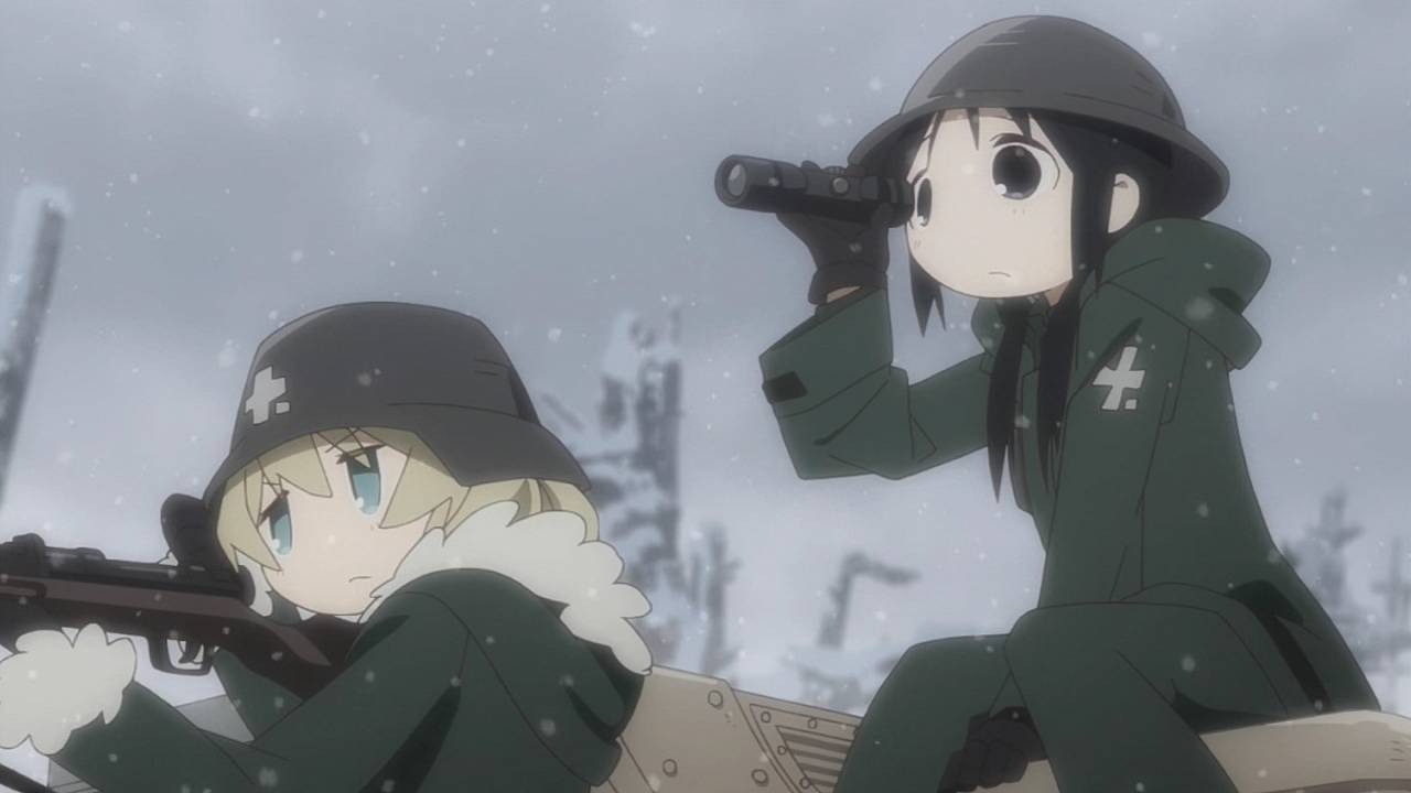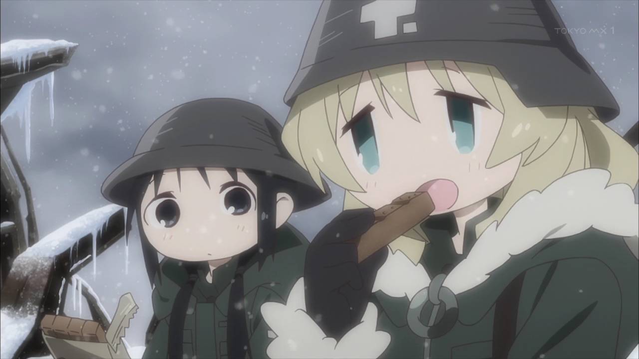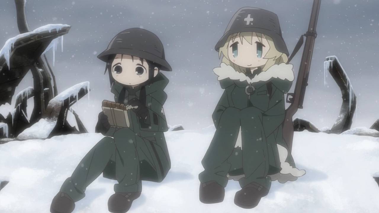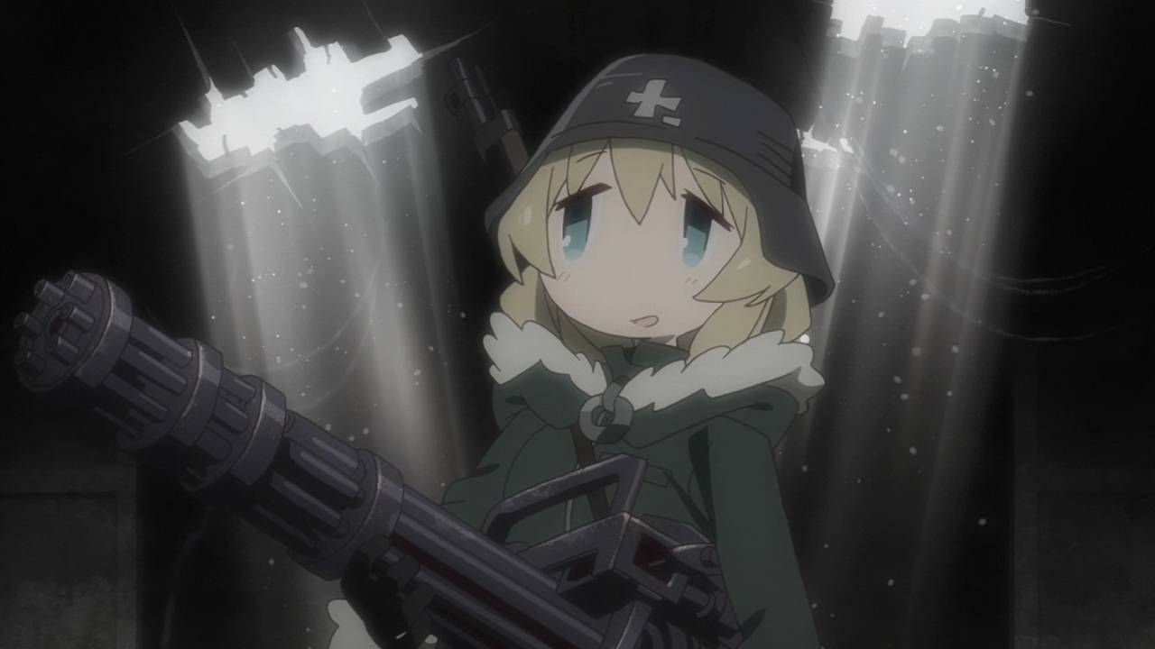 「少女終末旅行」第1話:舞台は完全に荒廃しきった世界。中二心を刺激されるとか言っていられないくらい、本当の本当に荒廃しきった世界。たった2人しかいない登場人物がどれだけポップに騒いでも、世界観自体が廃墟やら雪やら壊れた武器やら、冷たい物ばかりで構成されているので、殊更物悲しい。