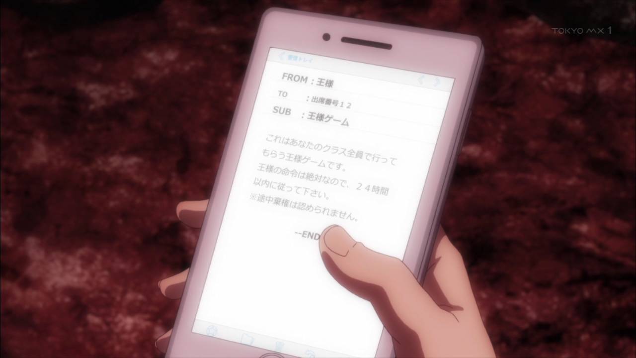 秋の新アニメ『王様ゲーム』1話見た。今期のデスゲーム枠ですね(十二大戦もだが)。こういうありきたりなデスゲーム...実は好きです。今後も楽しみだわ。しかし主人公ェ...。経験した事あるならもっと早く対策打てよと...。