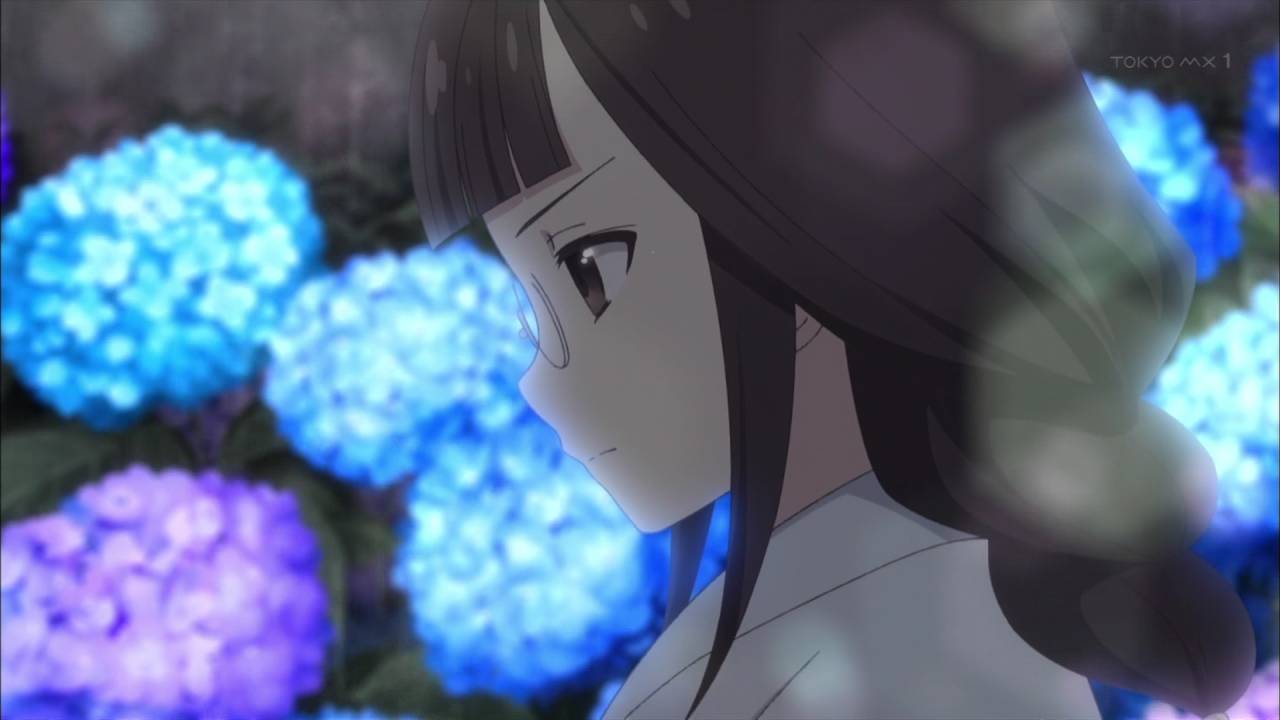 このはな綺譚の最新5話Bパート、紫陽花や傘以外は彩度をかなり落とし、ラストシーンの虹がかかる所で鮮やにする演出、ベタだけれどとてもアニメらしくて綺麗な一本だった。