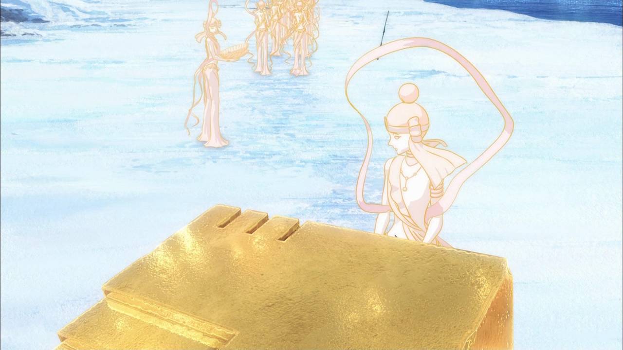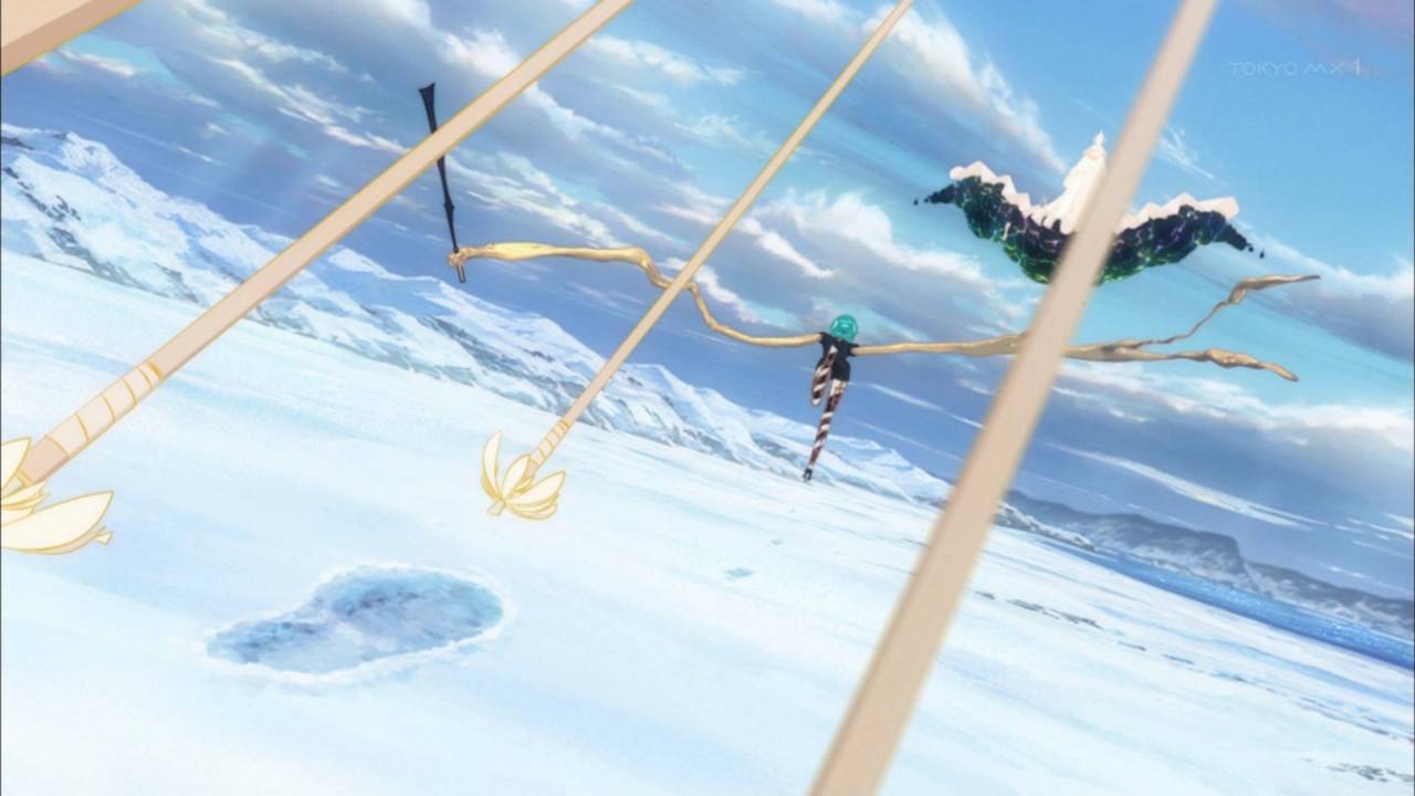 宝石の国8話:冬編の最後 映像化するとこうなるんだなぁと 流氷の恐ろしさ、サーフィン的な動きや月人の新しい罠、先生と月人とのやり取りなど映像になったことで新しい魅力が出ているシーンが多くて満足度が高い 戦闘中のフォスの状態もわかりやすくなったし、劇的な見せ方だったなぁ