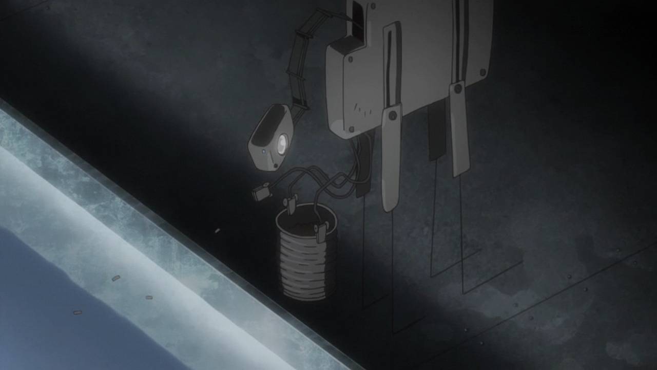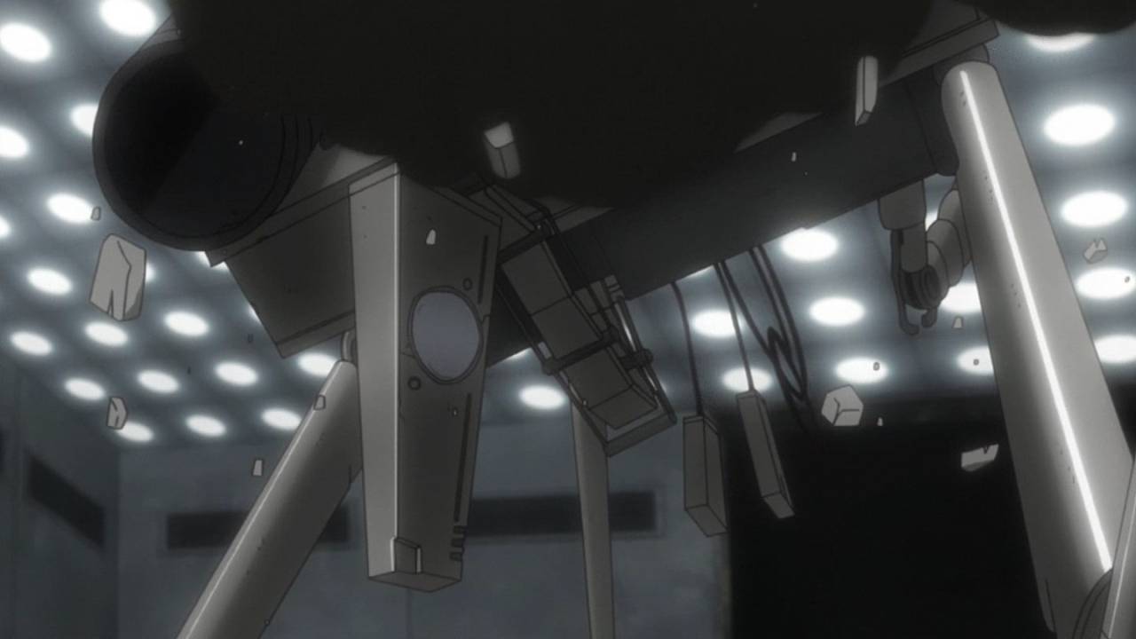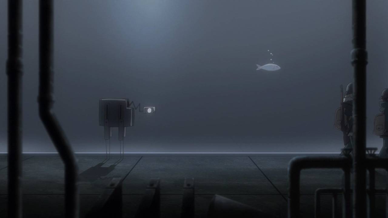 「少女終末旅行」第9話:生命の定義、破壊と進化の同一性。突然変異を起こしたサカナと、自律機械の暴走で破壊されゆくだけの都市。仄かに宗教の匂いすら感じるこの手の話を、機械都市の中でやるというのが凄い。それと、自律機械のデザインも良い。見ようによって、未来的にも原始的にも見える。