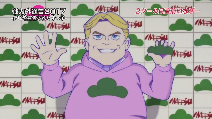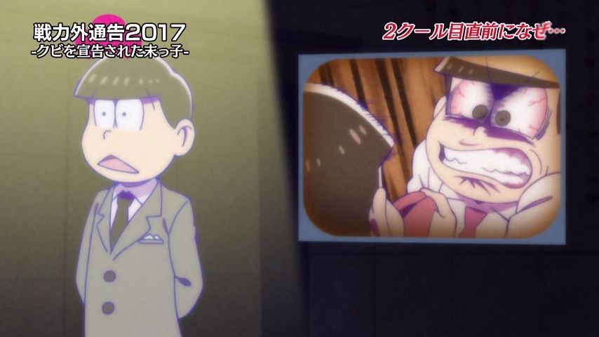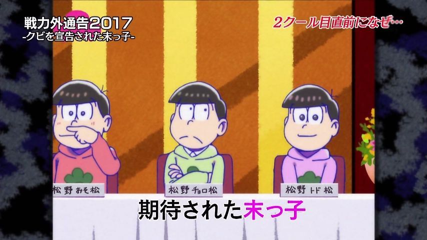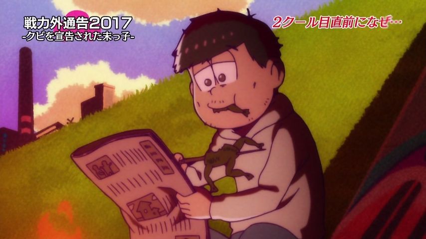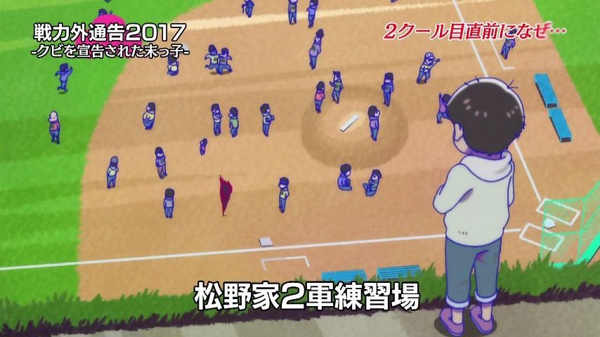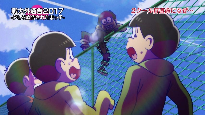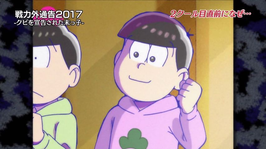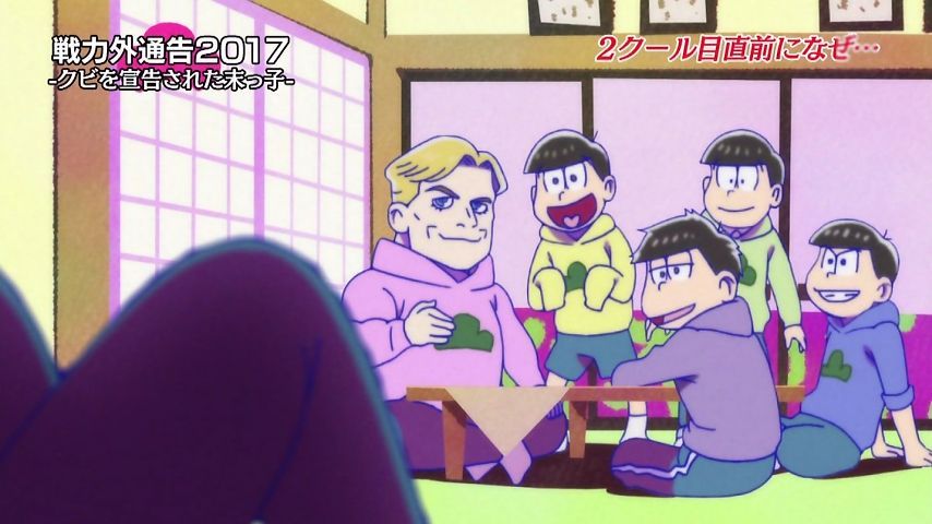 Aパは年末絡みの小ネタ集、Bパはトッティの戦力外通告。シュールとジョークのメリハリが効いた1話という印象。特に他局名物番組を利用し、己のキャラで笑わせながら遠巻きでその番組を茶化す姿勢にスタッフの士気上げを観たw 本作に求めている姿勢はこれよこれ!#おそ松さん