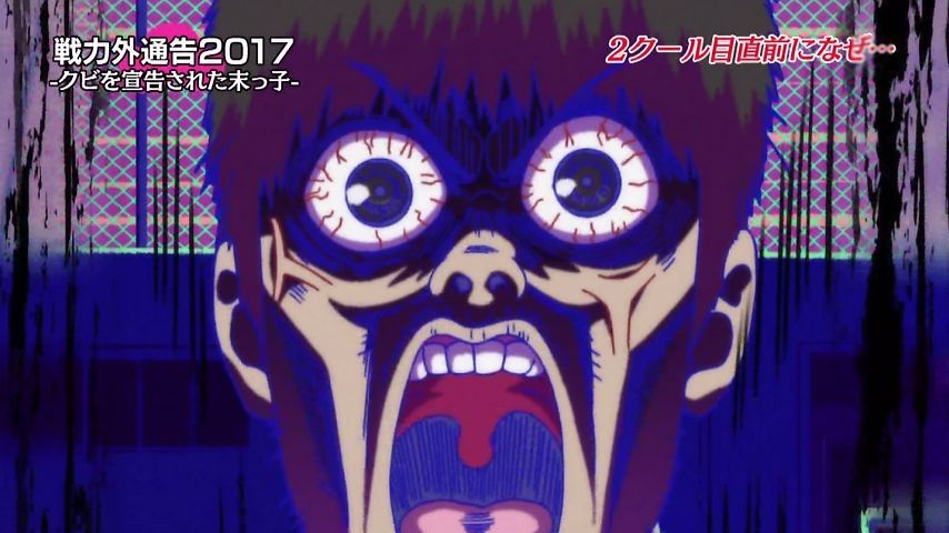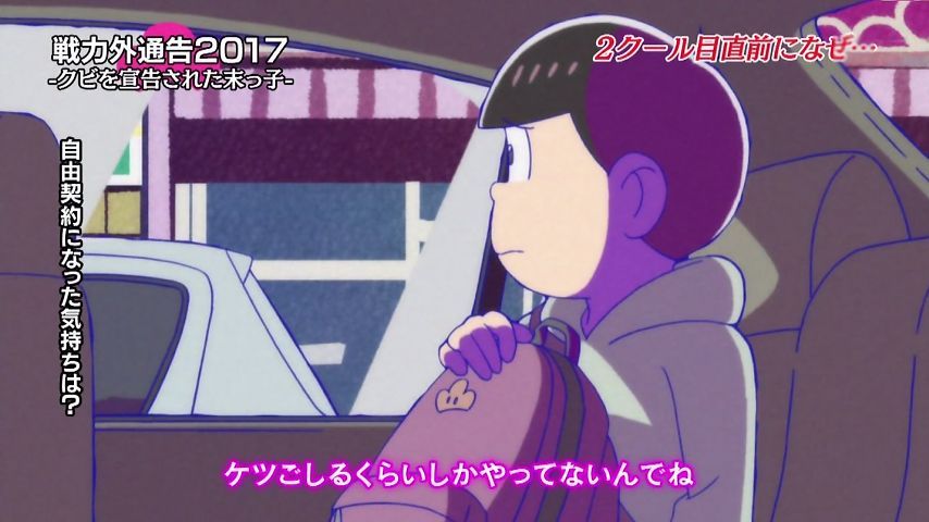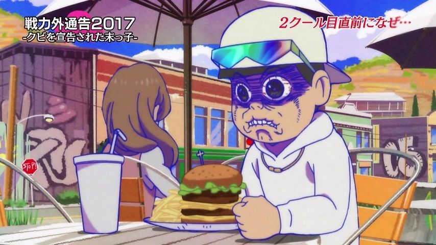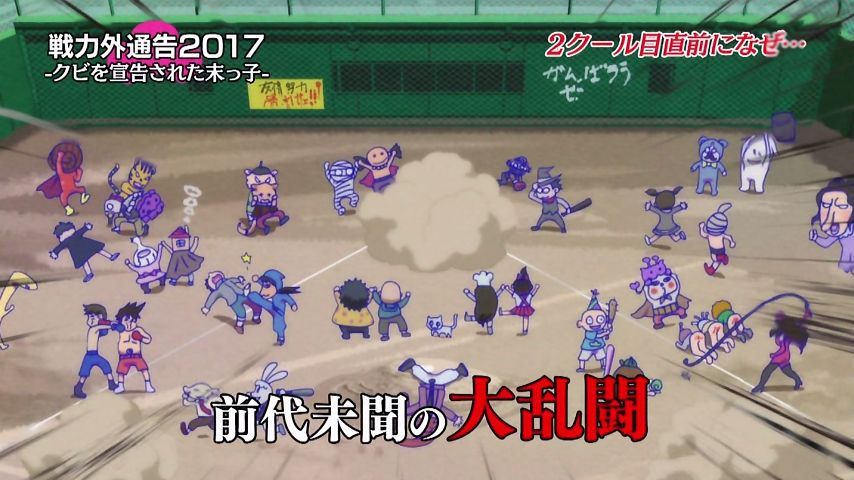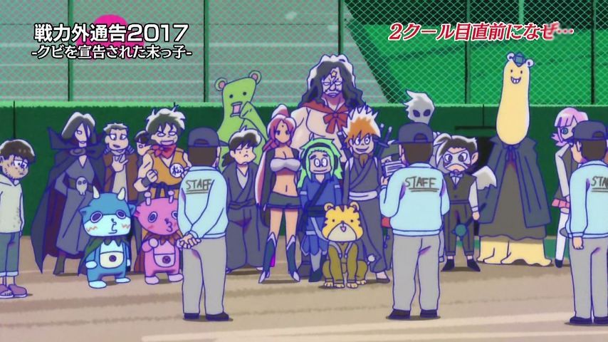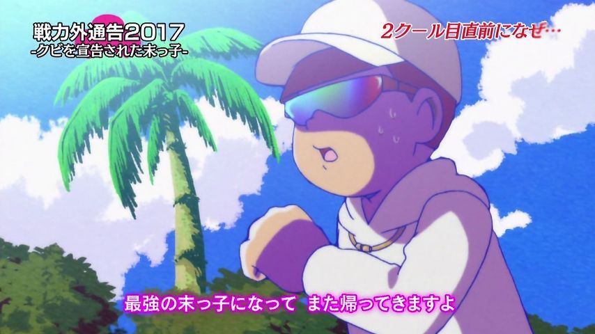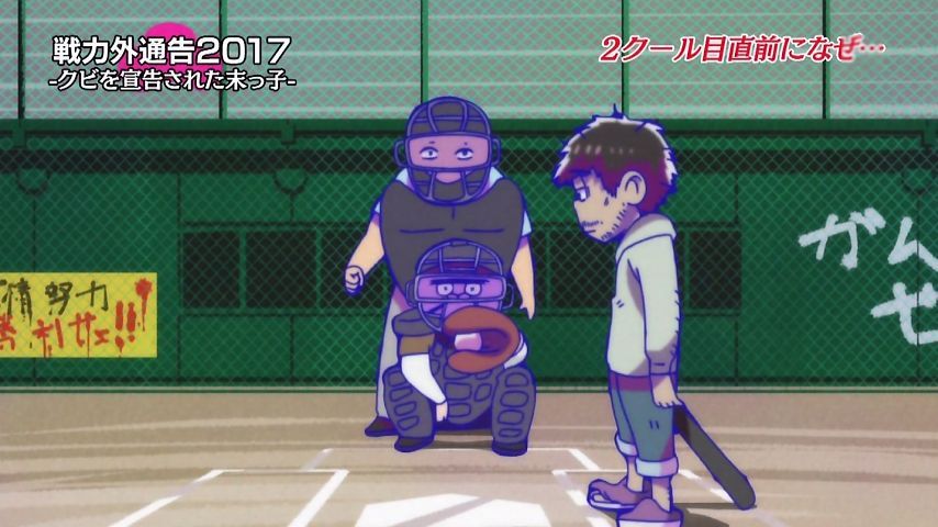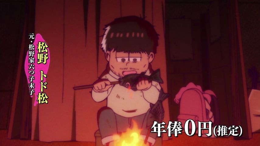 Aパは年末絡みの小ネタ集、Bパはトッティの戦力外通告。シュールとジョークのメリハリが効いた1話という印象。特に他局名物番組を利用し、己のキャラで笑わせながら遠巻きでその番組を茶化す姿勢にスタッフの士気上げを観たw 本作に求めている姿勢はこれよこれ!#おそ松さん