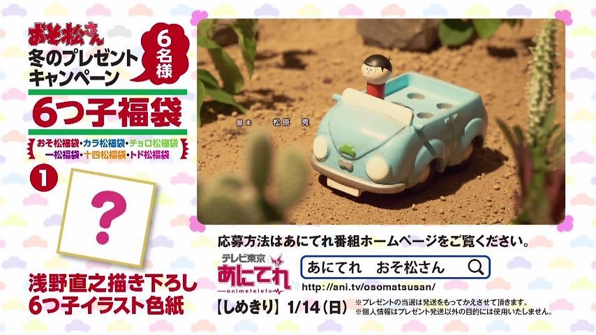 #おそ松さん 2期13話、前半は年末らしい短編がいくつか。オチがぶっ飛んでておそ松さんらしい。笠地蔵あたりであれ?トッティいない?と思ってたら戦力外通告。車内でのインタビューとかまじめにパロディしてて見応えあり。トド松が海外行ったまま年越すのかと思った。