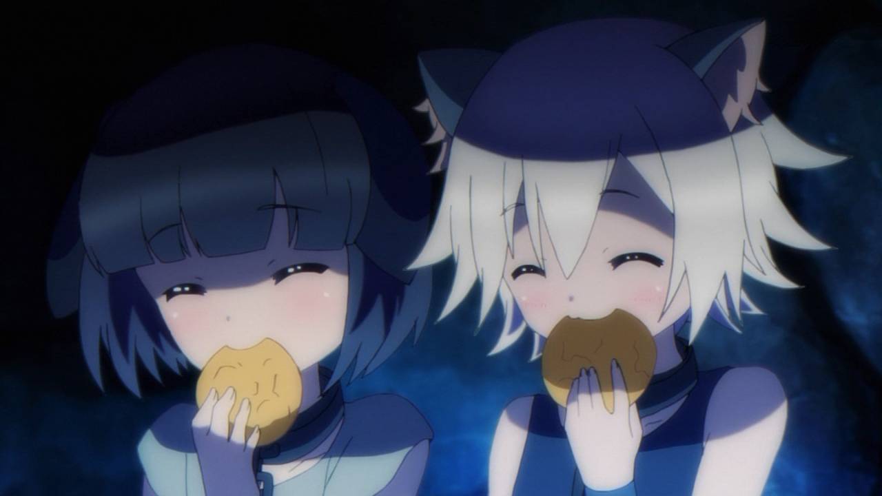 一心不乱に食事をしている獣娘たちを気遣って静かに歩いていくサトゥー、それに気付いて慌て出す獣娘達、