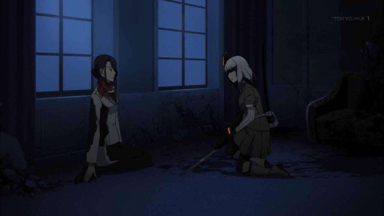 刀使ノ巫女22話。過去/現在で意志のない剣を振るっていた沙耶香と歩を対比させることで、意志のないようで誰よりも一途だった夜見の最期が彩られる。強者に媚びへつらって空虚な自分を満たしていた高津学長と、相手が何者でもなくなった後でも変わぬ忠義を尽くす夜見の対比でもある。#tojinomiko