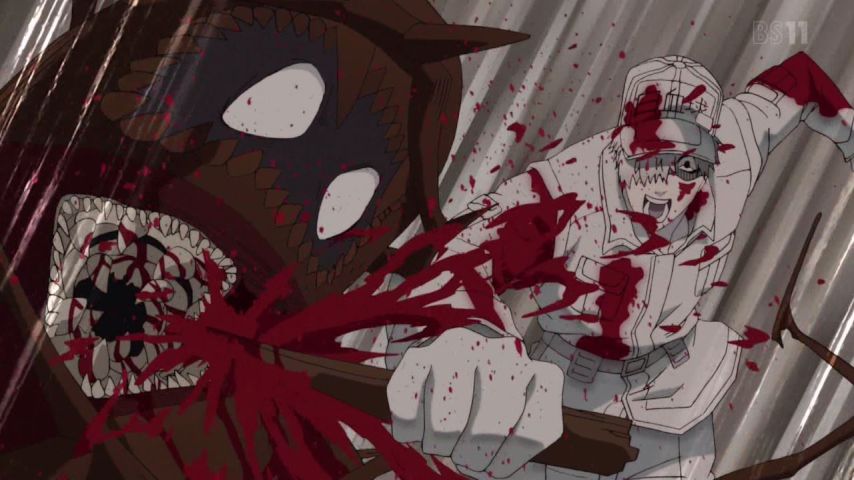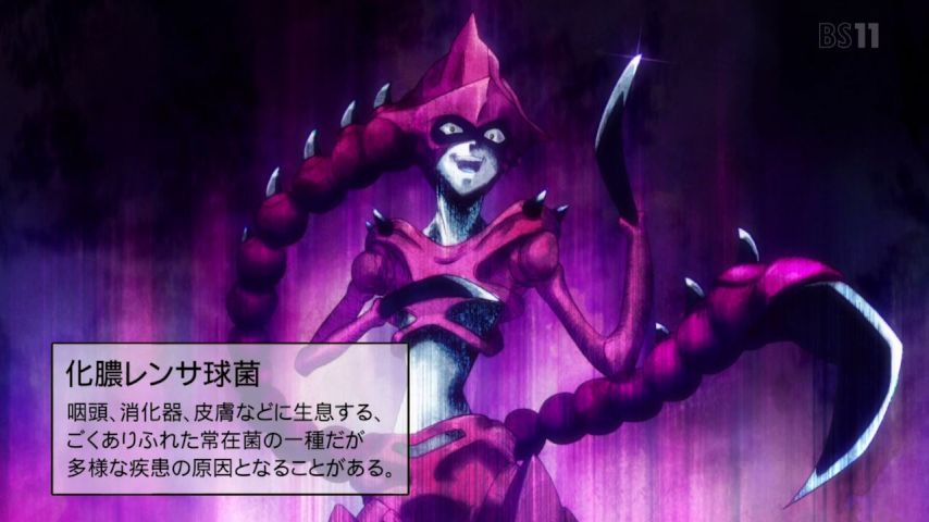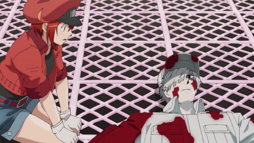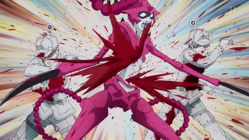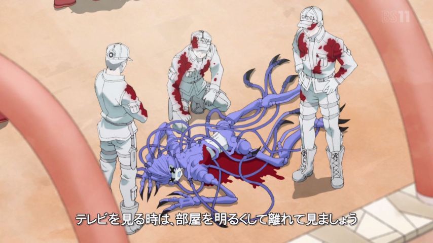 はたらく細胞、2話。擦り傷のせいで限界ギリギリ修羅場バトル。大袈裟にして笑わせている……というのはあくまで視聴者の視点であって、やってる体内の連中は大真面目なのでちゃんと緊迫感もあるし非常に熱い。けど赤血球や白血球が細菌の返り血を浴びまくってるのは冷静に考えると、あの血は何なの?
