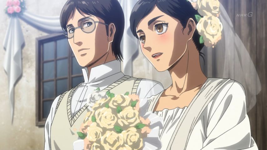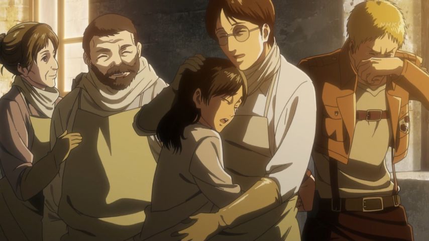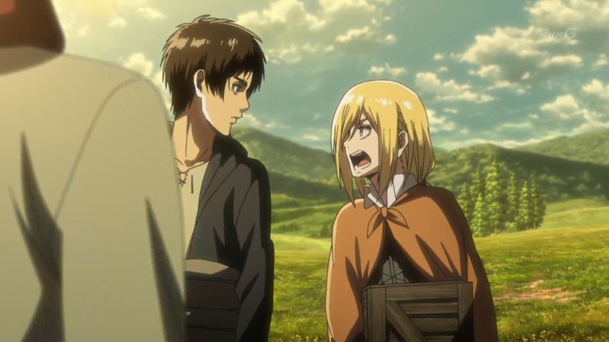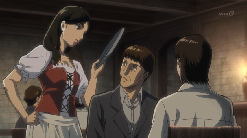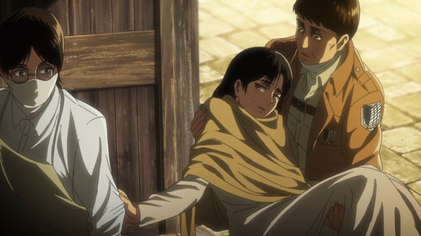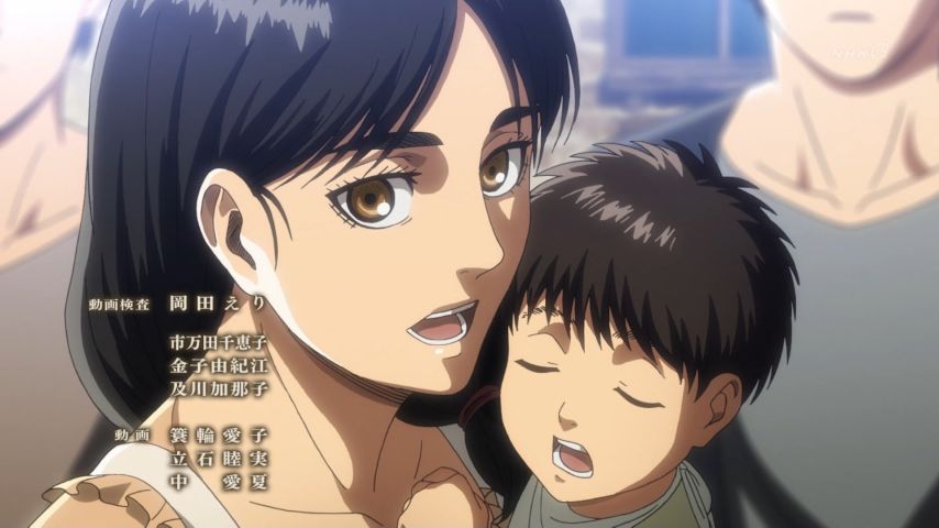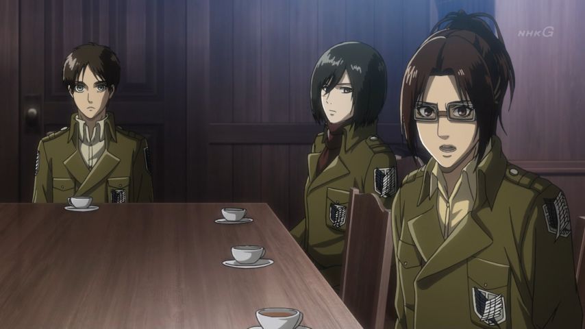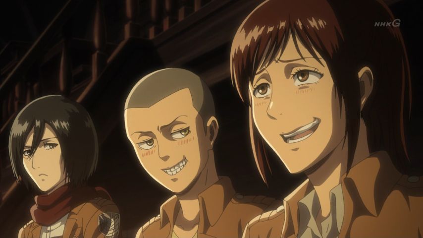 進撃の巨人 Season 3 第48話。緩やかに、けれど確かに訪れる変化。エレンとヒストリアの前に現れたミカサの表情、テンション高めなハンジさん、教官の部屋で昔を思い出して起立するサシャに笑い。そして傍観者が語る過去と(原作でもだったけど)カルラ母さんの言葉には本当に胸打つ涙…