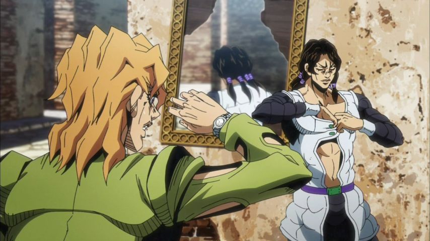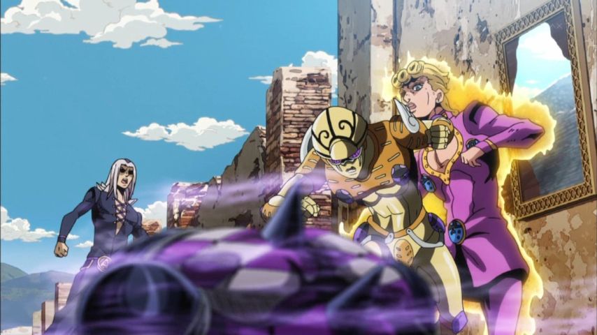 『ジョジョの奇妙な冒険 第5部』第12話視聴。最強&最恐&最狂のスタンド:パープルヘイズが登場するも、あまりに強すぎるため「鏡の世界の外と中で隔離されている」という特殊すぎる状況での初陣になってしまうという。