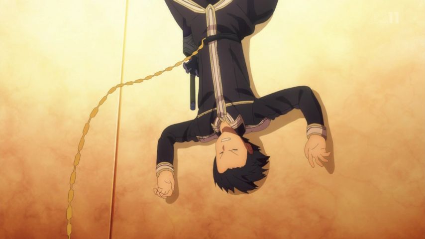 なるほど、ここでアリスと親睦を深める展開w。アリスかわいいし、バカ高い塔の外壁で命からがらという不安定な状況下での掛け合い面白かった! その一方ユージオは入浴中のアーチャーwと遭遇とは運がないw #sao_anime