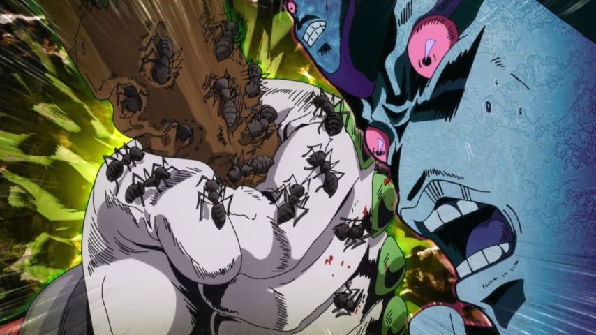 OPで何回も観てきた血の滴,ポルナレフ対ディアボロ戦でも説明されたがジョルノが実践,時が飛ぶ瞬間BGMもストップするからスリル感で心臓に悪い
