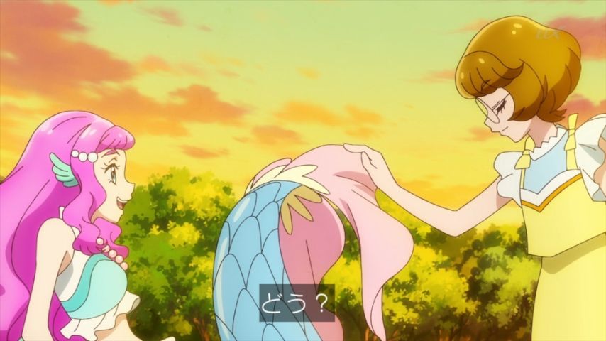 トロプリ4話、キュアパパイヤのメガネを外すバンク、自信の無い自分を脱ぎ捨てるみたいでめっちゃいい!今までフィクションだと思っていた人魚の尾鰭を触ったリアルっていう感想も多分空想に閉じこもっていた頃から踏み出したってことだよな。