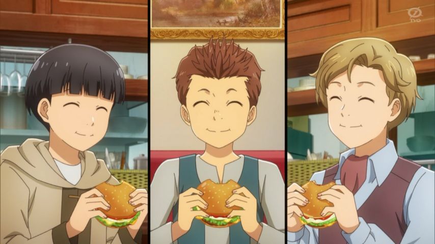 異世界食堂2 3話。うまいっ!うまいっ!ハンバーガーとカレー。色々食べさせても最初のに戻る変色家達。私はうまい店はメニュー制覇する方。有楽町下の台湾料理店はうまかった…。しかしメニューが多い店。店主、仕込みだけで大変。
