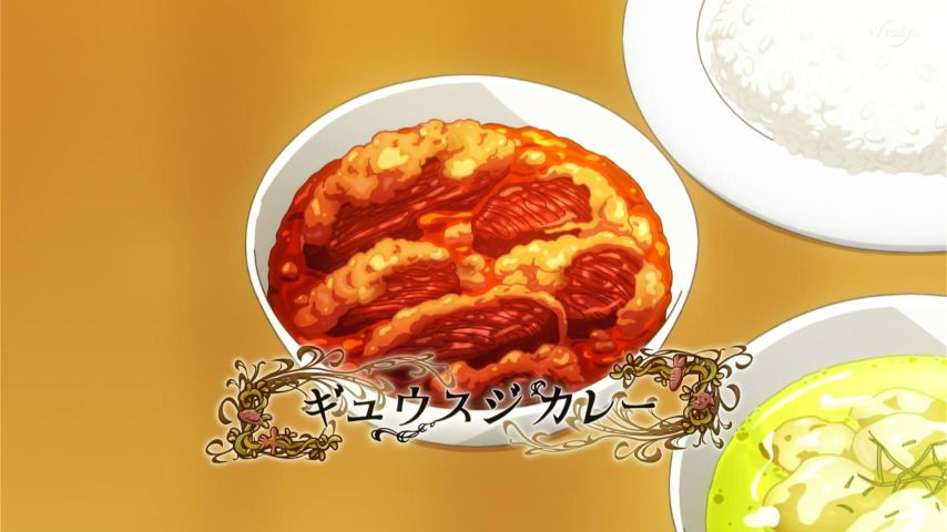 異世界食堂2 3話。ハンバーガーとオリジナルのギュウスジカレー。どちらもアレンジが効いていて良し。…ところでアレッタの角が立派なことになっているなぁ。原作だと飾り程度の小ささのハズなんだけど(汗)。