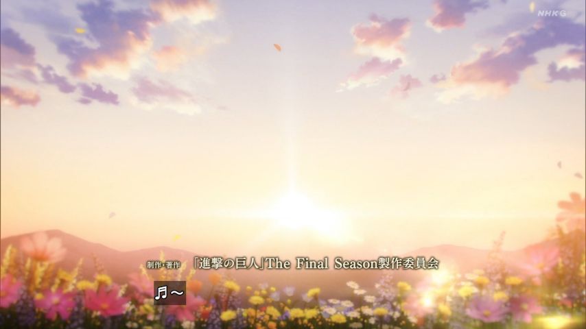 ファイナルシーズン後半戦開幕。エレンを討ち取るべくシガンシナで展開するマーレ軍残存勢力VSパラディ軍。殺し合いしてるのに憎しみよりも強い何かが溢れているライナーVSエレンの図…。実質最後のOP&EDも壮絶で美しい。