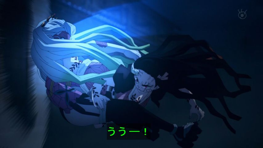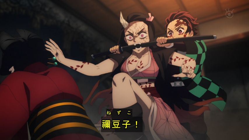 ____/ イー┘ | 禰豆子を戻そうとする炭治郎と堕姫のために出てくる妓夫太郎