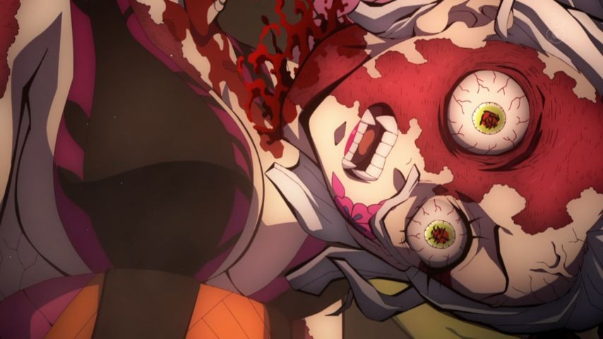 ネズコの血鬼術によって爛れて目見開いている堕姫コエェー