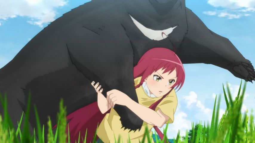 はたらく魔王さま!!9話、エミリアがいるので熊が出ても緊張感はなかったですがアバンで倒しましたねw ウィリーウィリアムスのように熊殺しの異名をゲットです。畑泥棒の車の屋根をこじ開けて、そこから見えたエミリアの顔すごかったですねw