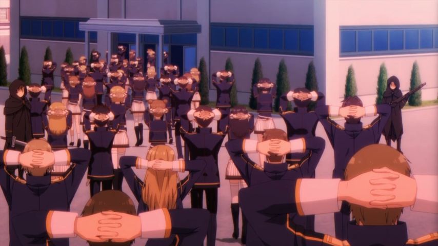 「陰の実力者になりたくて!」第8話:学校を占拠するテロリストは中二妄想の華。厄介な中二患者はディテールにもこだわる。確かに、真っ昼間から黒ずくめで潜入とか、見た目に引っ張られ過ぎて目的を見失っているとしか思えない。シドの目線が終始メタなせいで、どんな危機的状況もユルさに変わる。