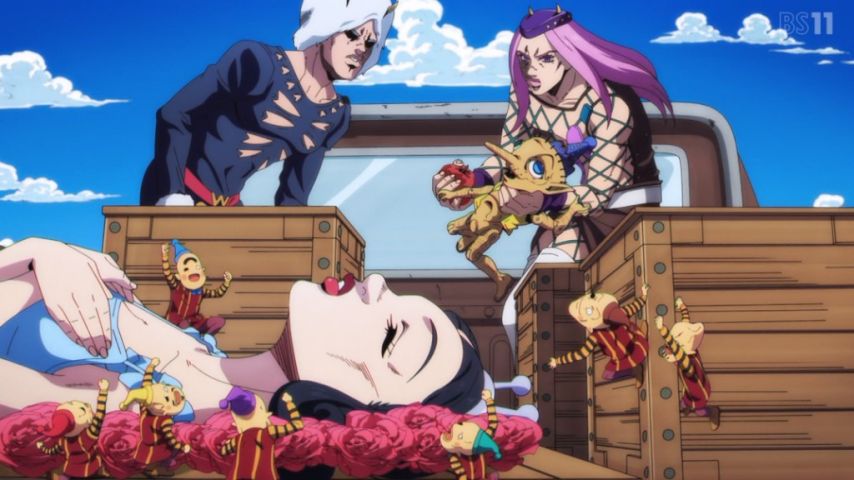 ジョジョの奇妙な冒険ストーンオーシャン25話は徐倫とエルメェスを追いかけてたアナスイとウェザーリポートの前に現れたのが絵本とか漫画のキャラだった回