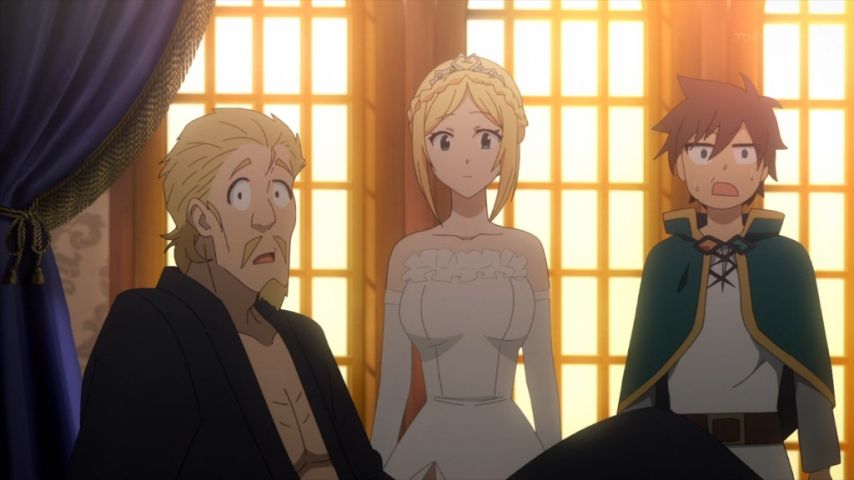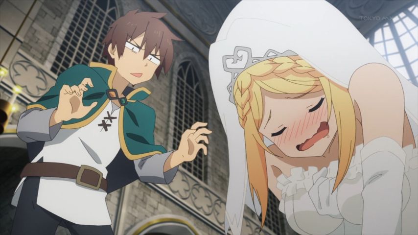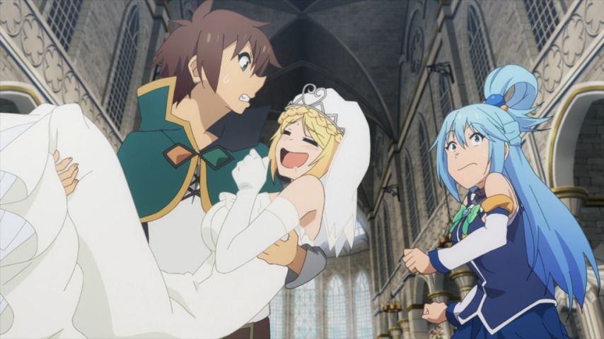 結婚式に乗り込んでアウェー必至のカズマたちだけど、冒険者も味方につけながら自分たちが場を支配するのは流石よなぁ。空気読まない3人だからこそできたこと。バツイチのダクネスでバツネス(笑)カズマにとっては格好のイジりネタができてしまった。4期来てほしい!