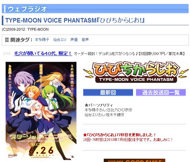 内容盛りだくさんでお送りいたしますので、是非お聴き頂けますよう、よろしくお願い致します。 TYPE-MOON VOICE PHANTASM『ひびちからじお!』
